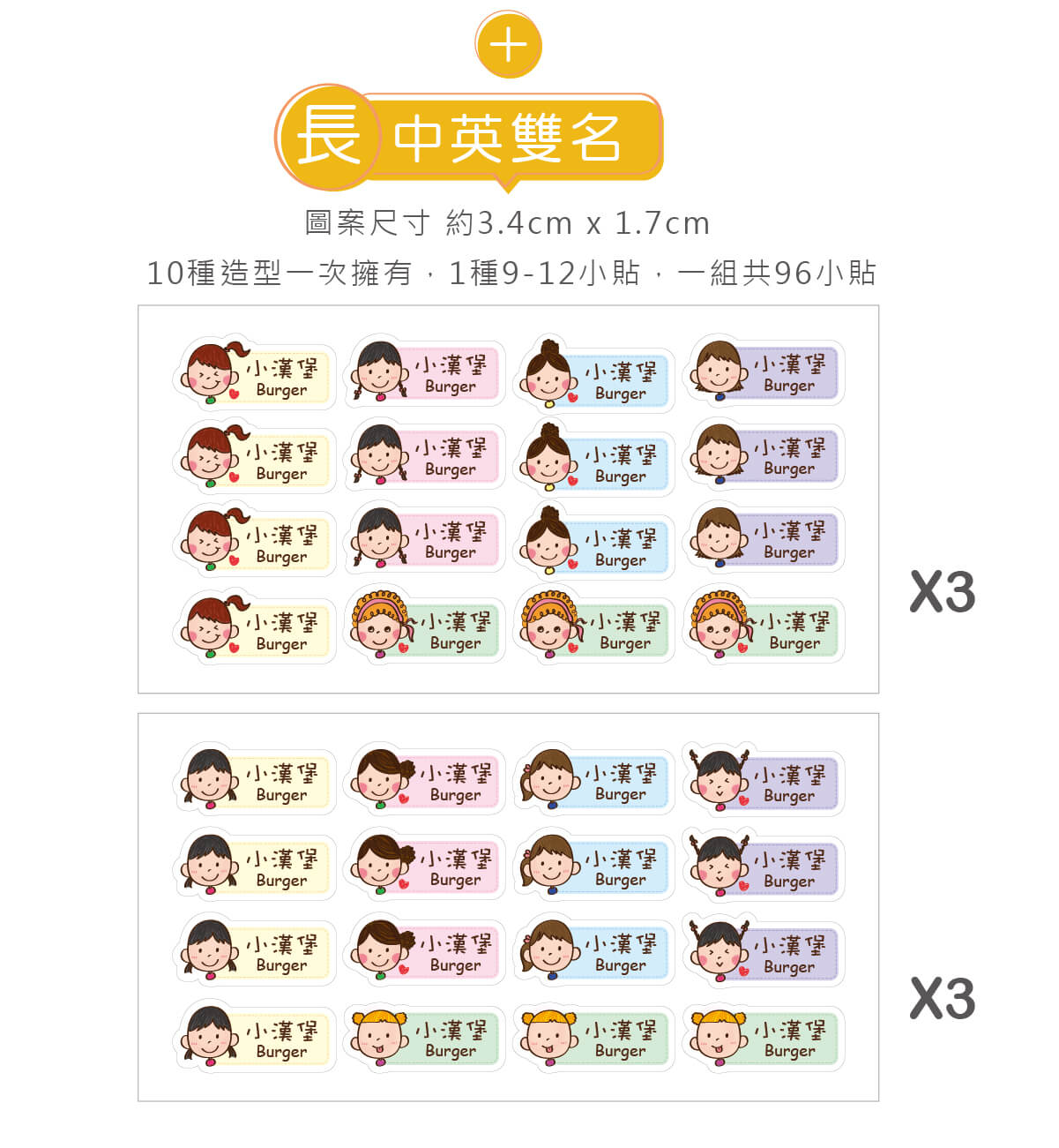 ▶ 一組高級防水姓名貼中英雙名(方形) 96入【俏麗女孩 】Q款