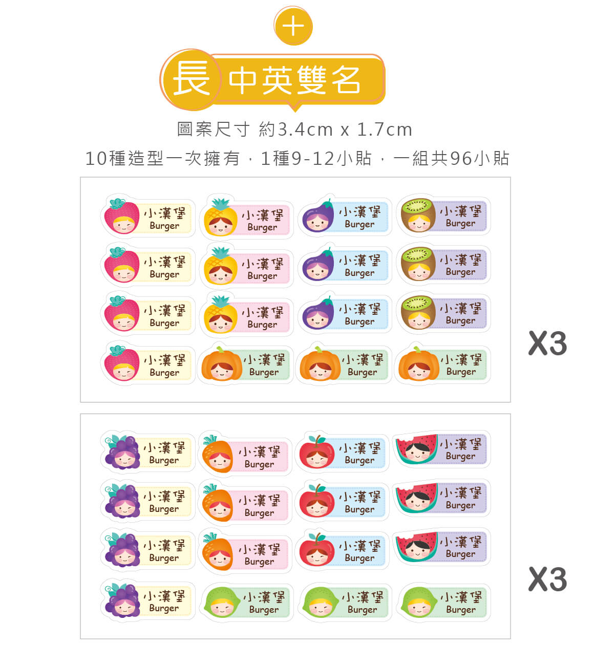 ▶ 一組高級防水姓名貼中英雙名(方形) 96入【蔬果女孩】L款