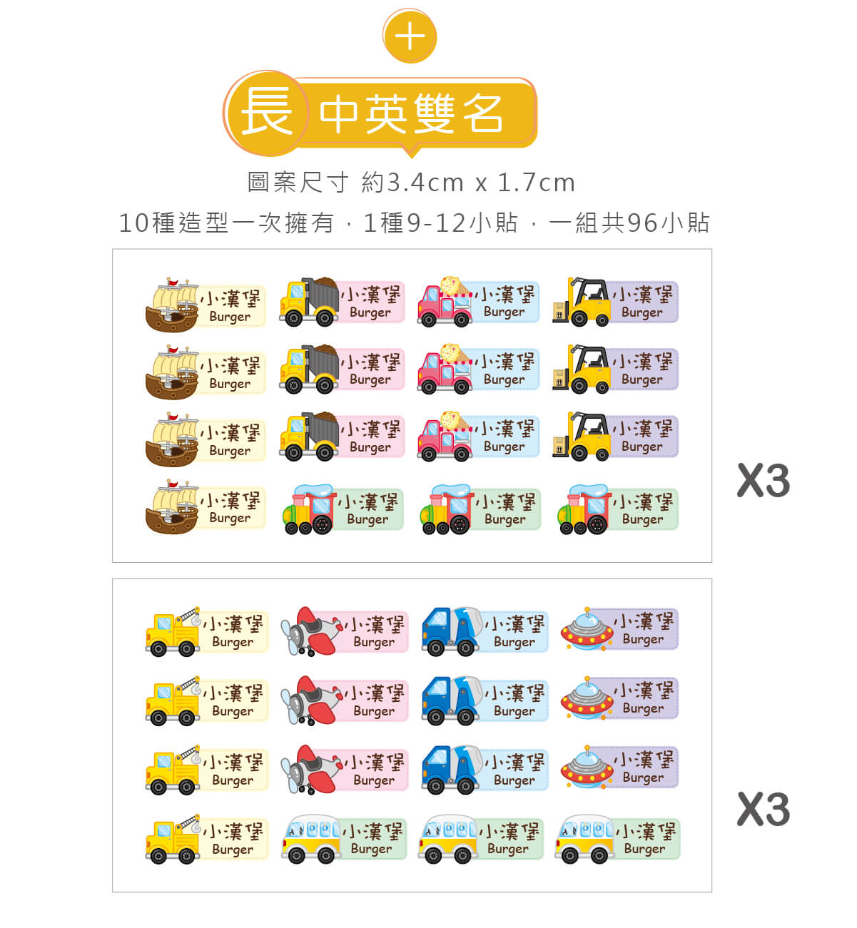 ▶ 一組高級防水姓名貼中英雙名(方形) 96入【交通工具2】V款