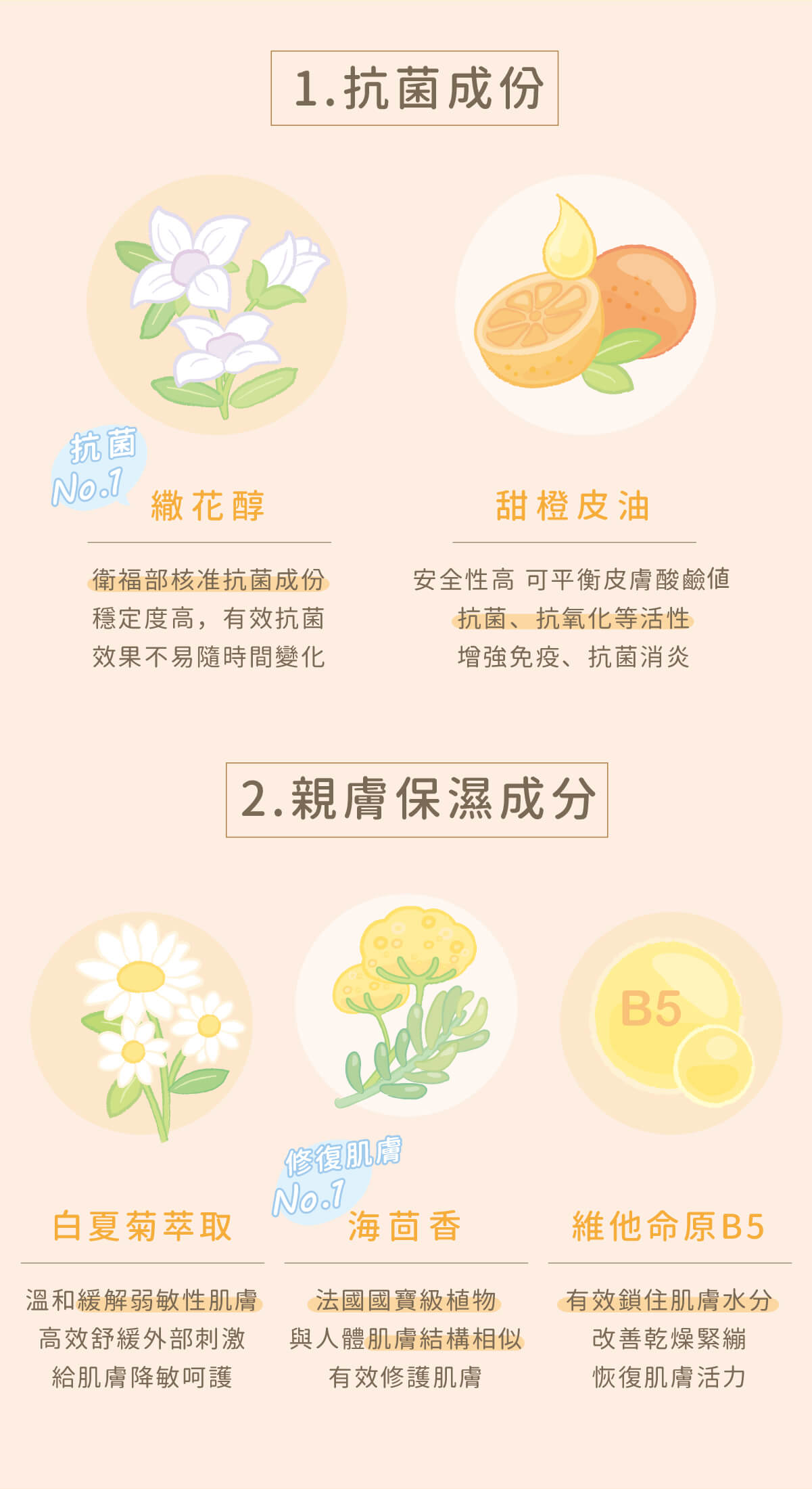 我們採用 衛福部核准的安全抗菌成份-繖花醇