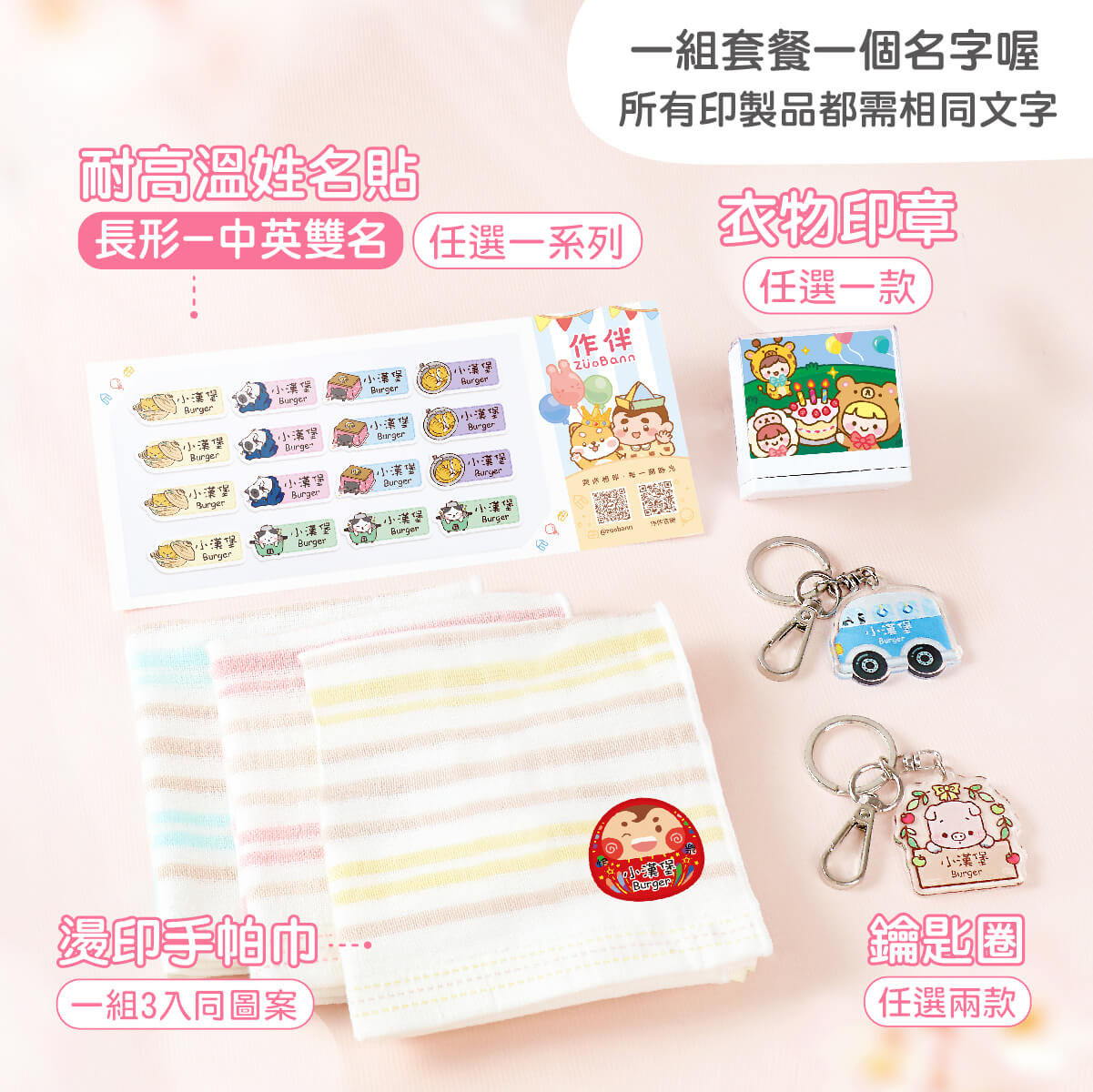 耐高溫防水姓名貼中英雙名(方形)+印章+鑰匙圈2入+燙印手帕組