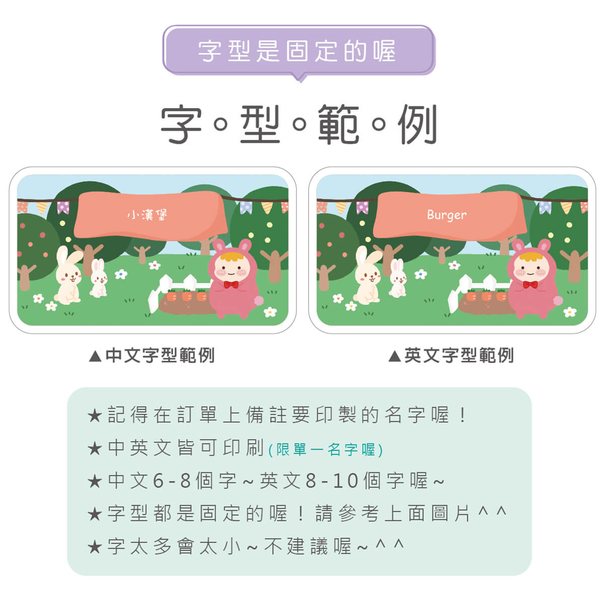 ▶ 字型都是固定的喔,如果想要中規中矩請備註要標楷體喔