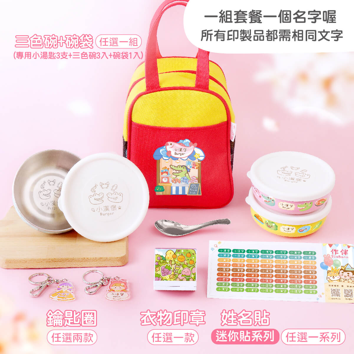 三色碗+碗+高級防水迷你姓名貼+印章+鑰匙圈2入