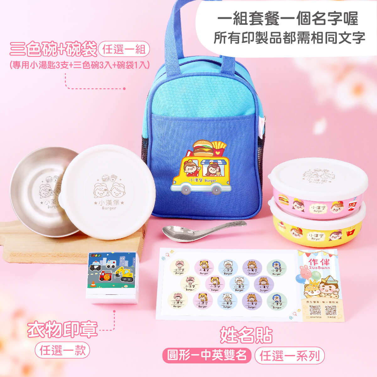 三色碗+碗袋+高級防水姓名貼中英雙名(圓形)+印章