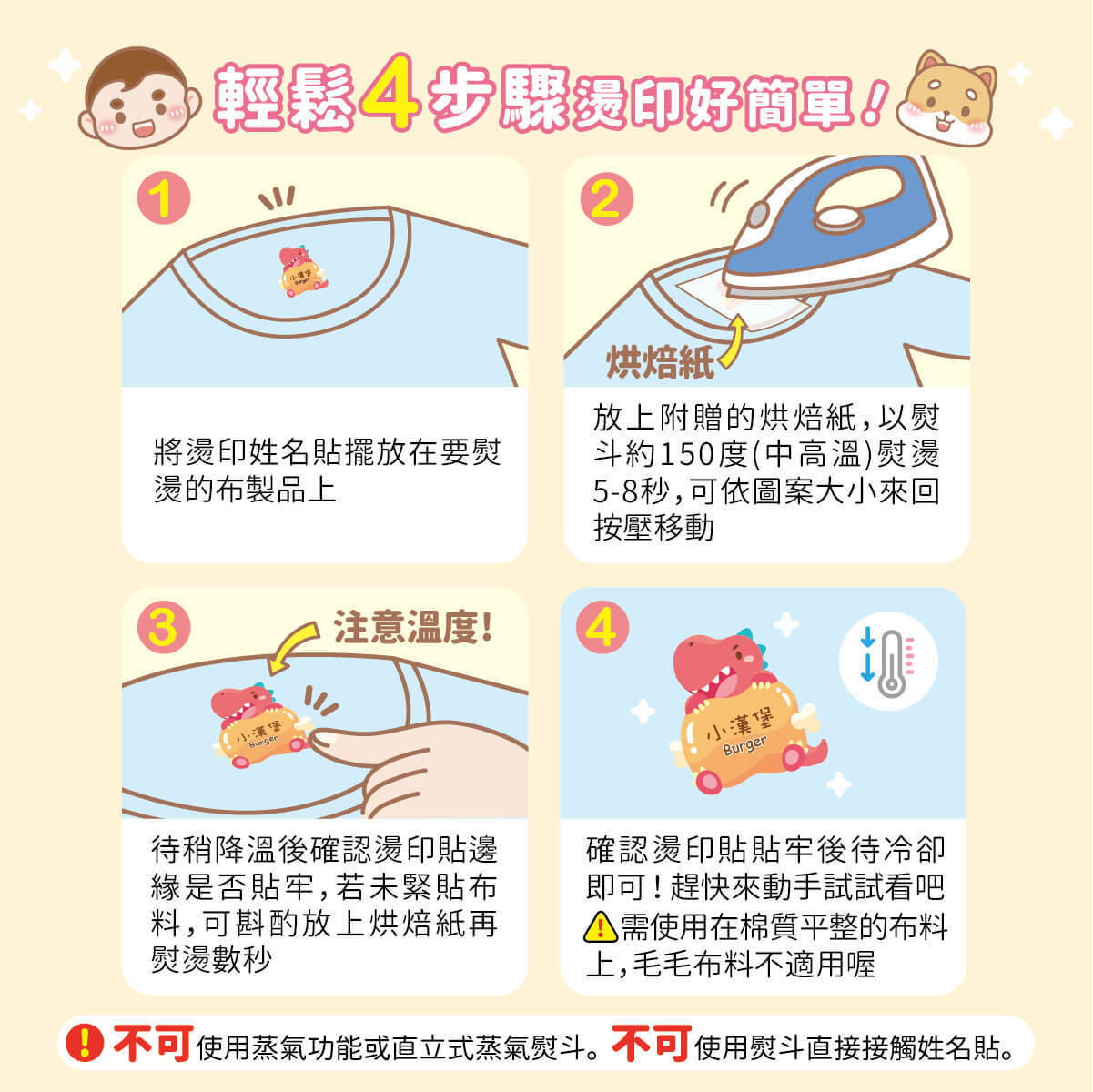 ▶ 燙印貼"不可"用熨斗直接接觸姓名貼