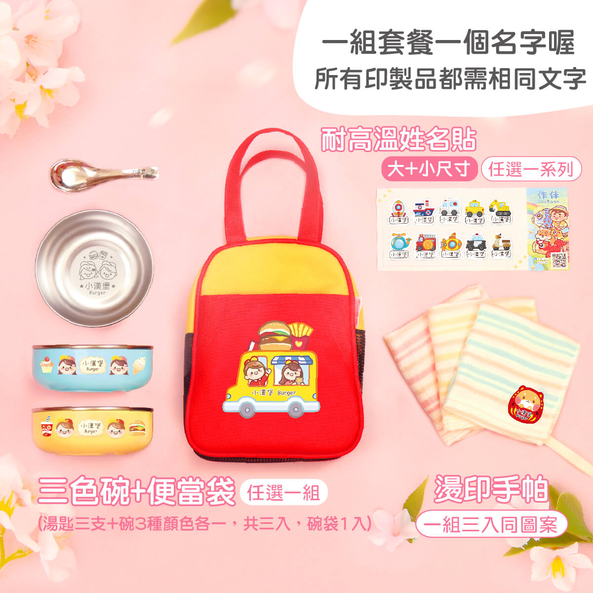 耐高溫姓名貼有大有小+燙印手帕巾3入+三色碗3入+碗袋