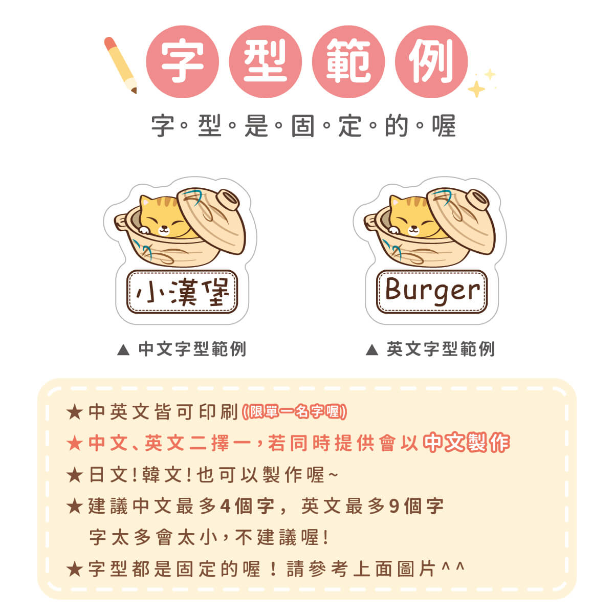 1. 姓名貼會依照訂單填寫內容製作,姓名部份不再另外做確認,請務必確認填寫內容是否正確