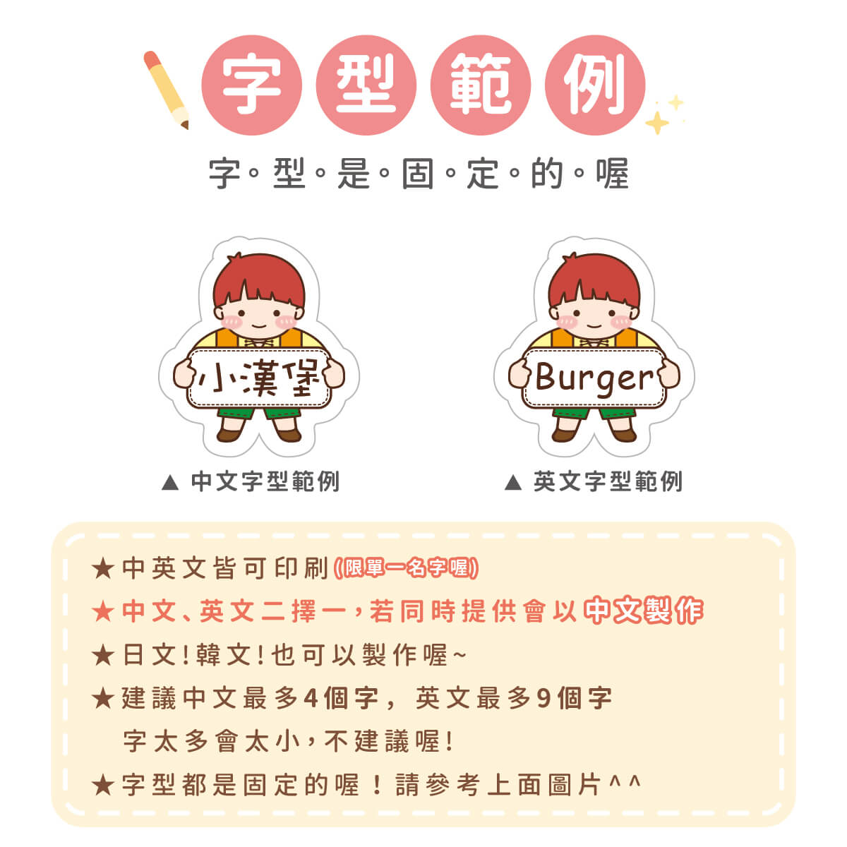 ▶ 此款姓名貼中英文二擇一,若無特別標示會以中文為主喔