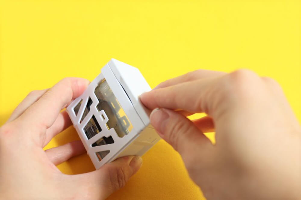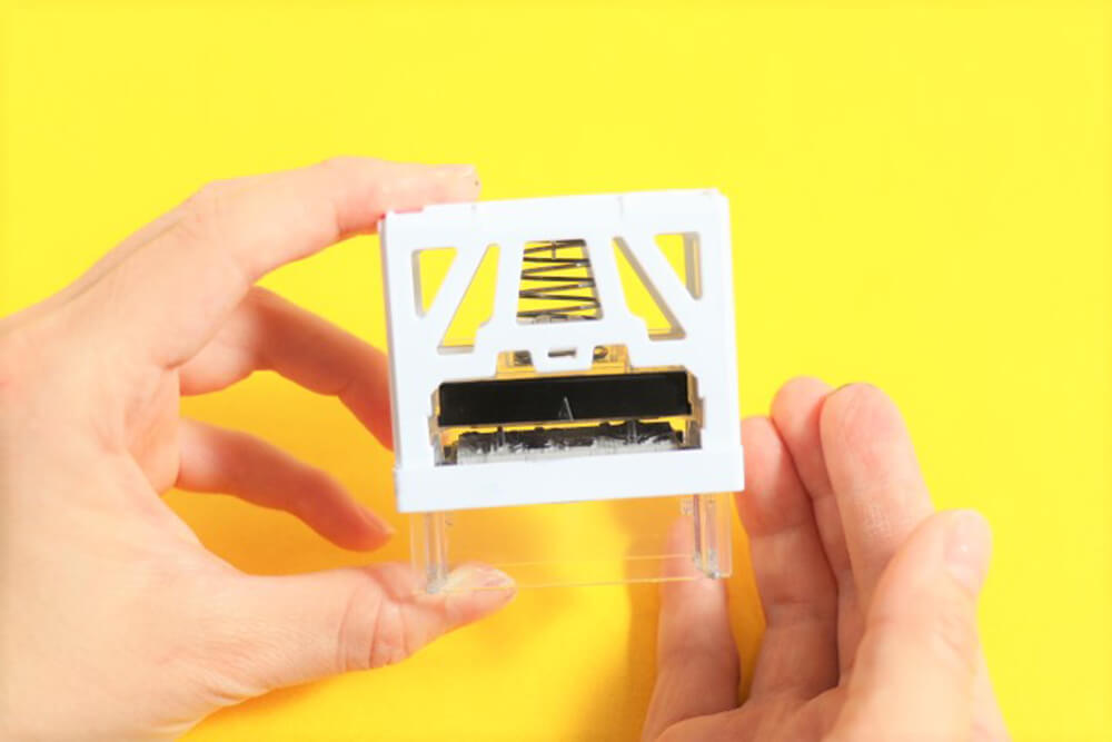 1. 一手放白條短邊,一手放雙面圖案,按下拔出。