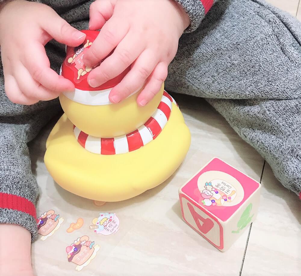 因為寶貝還沒有看過貼紙這種東西,第一次看到的時候很仔細的研究一番