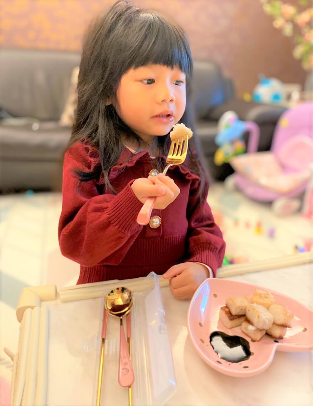 像小夏這樣差不多快五歲的年紀,我們慢慢開始讓她練習使用非幼兒的餐具,