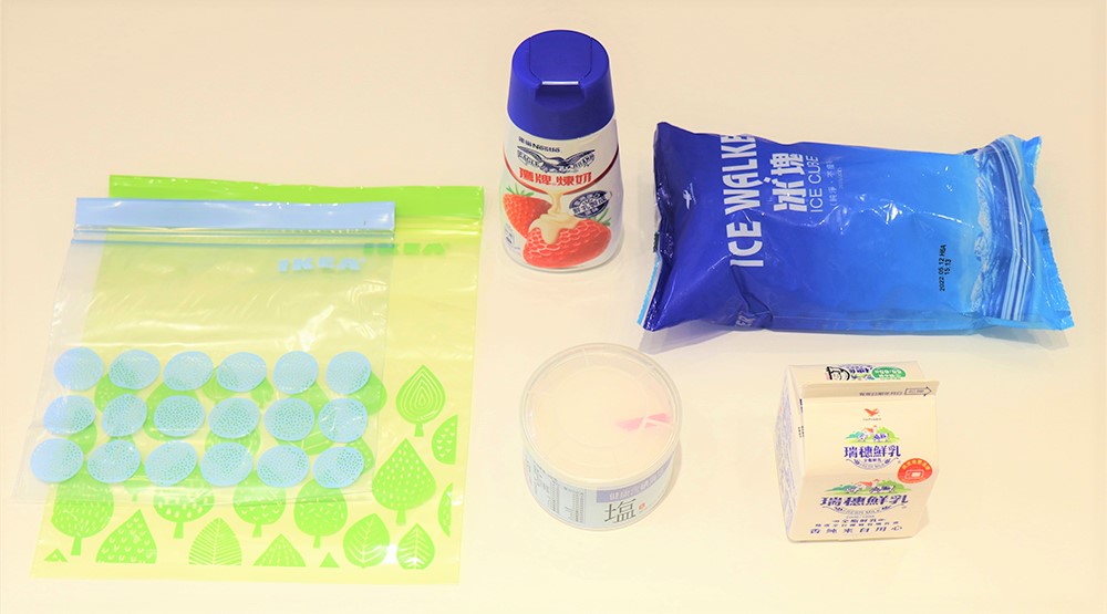 準備材料:大小密封袋、牛奶200ml、鹽巴200g、冰塊600g、煉乳適量