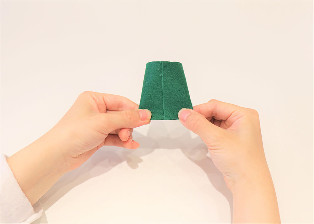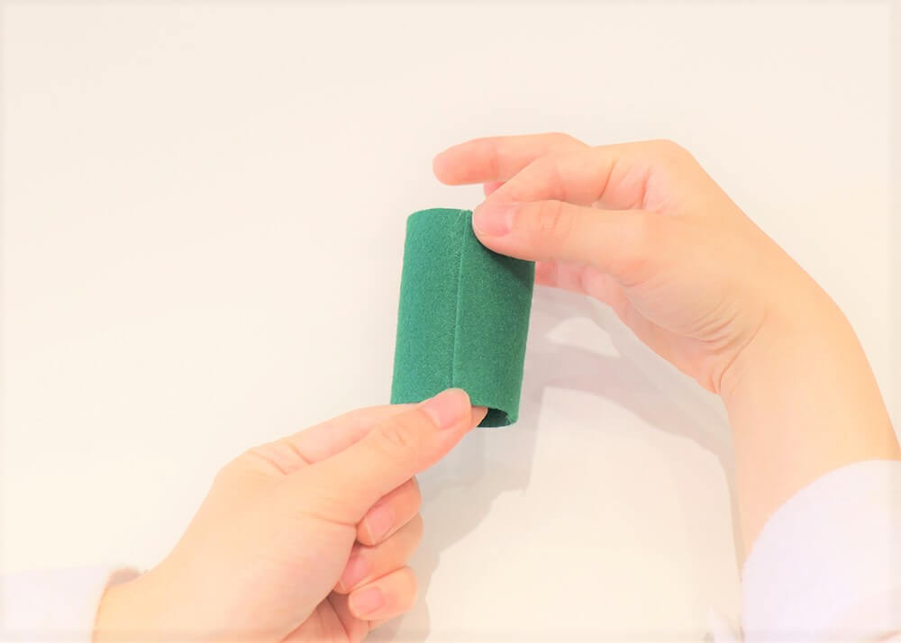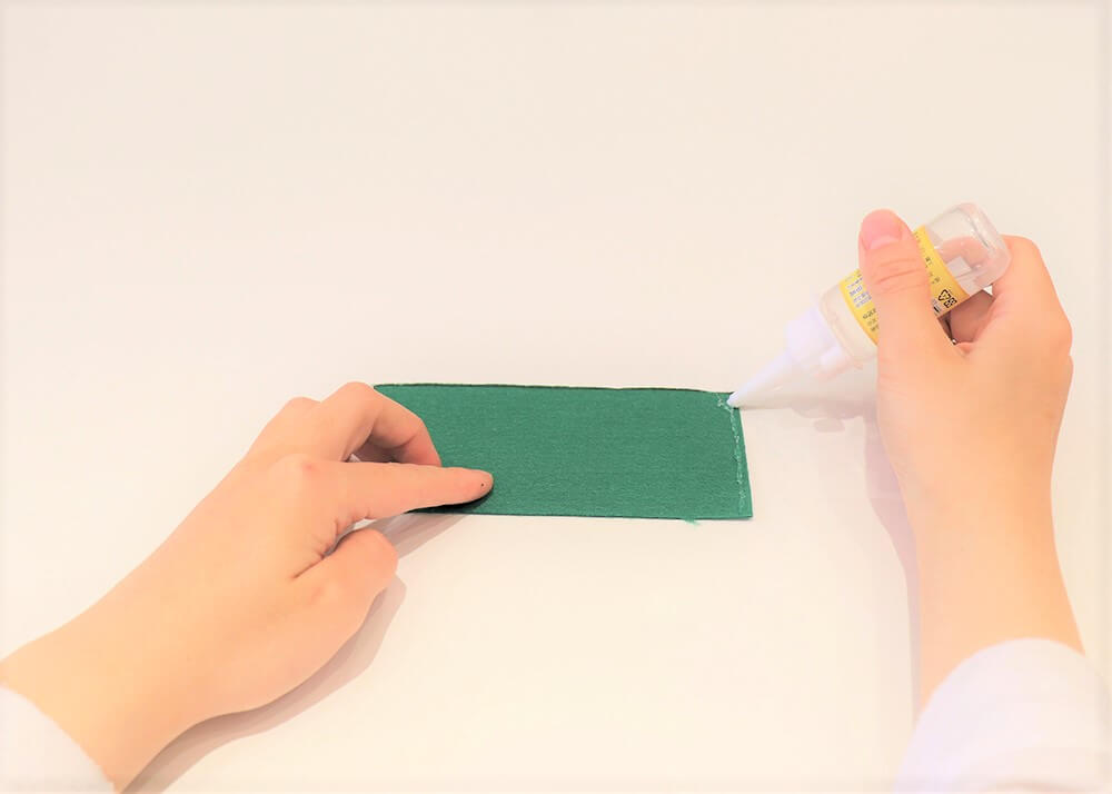 步驟1. 剪下一塊13cm*6cm的綠色不織布,在不織布一邊塗上保麗龍膠。