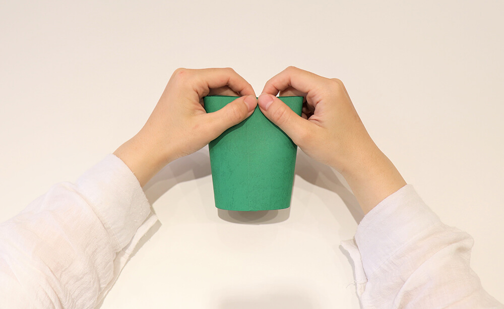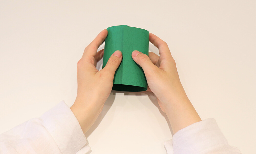 步驟2.撕下雙面膠後,將紙張捲成筒狀並黏好。