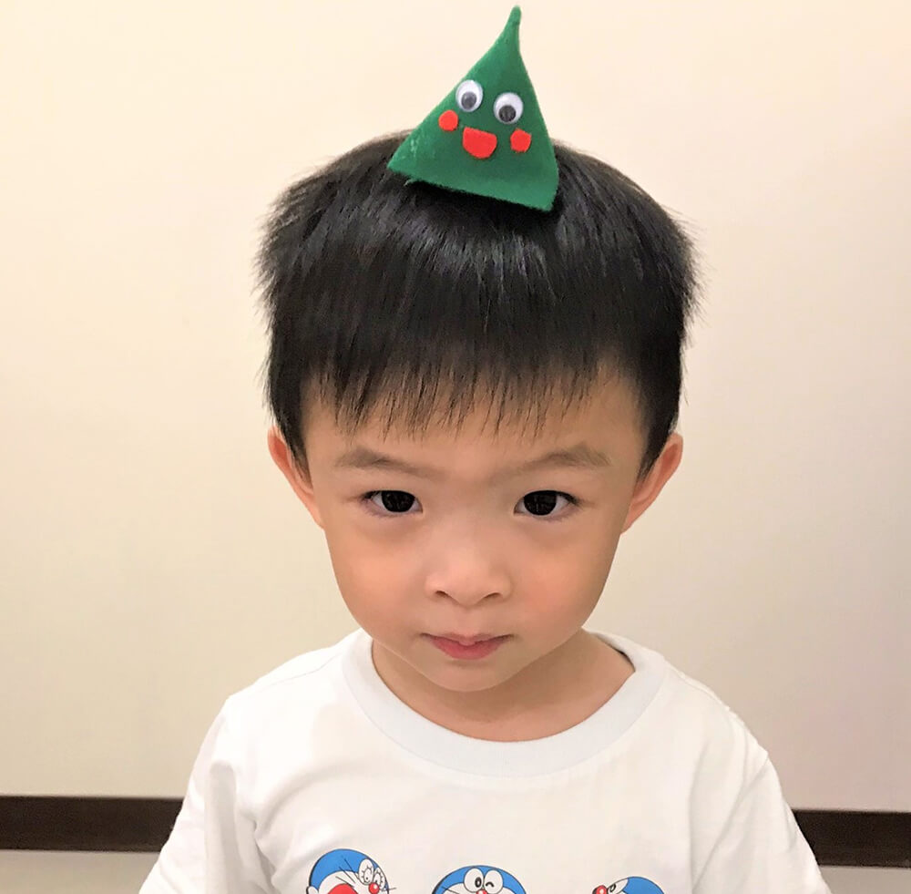 小漢堡開心的把粽子娃娃放在頭上
