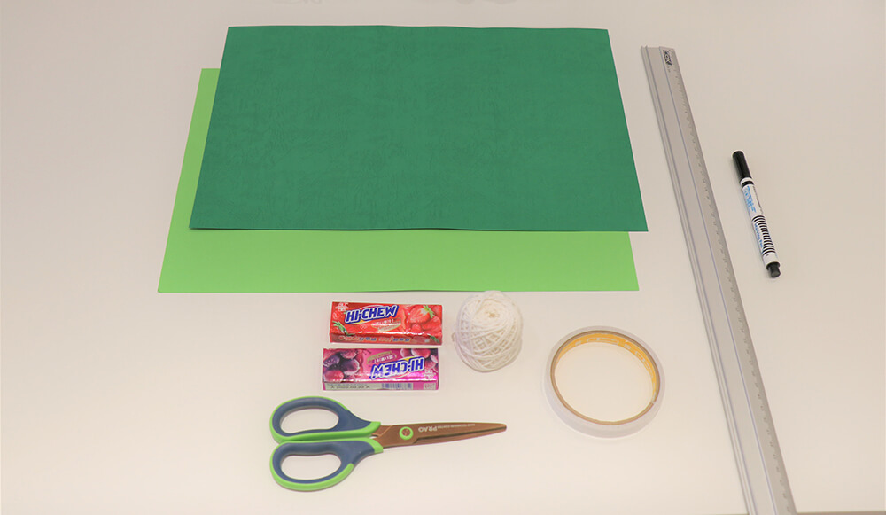 綠色色紙、尺、棉繩、剪刀、糖果、奇異筆、雙面膠。