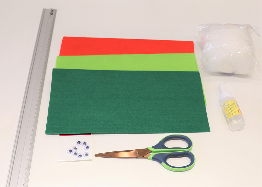 綠色不織布、紅色不織布、棉花、剪刀、保麗龍膠、動動眼睛