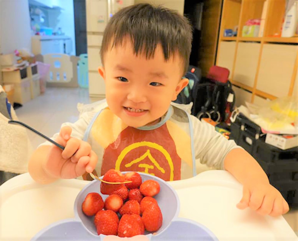C自己拿湯匙吃得很開心,他的是文青藍喔!