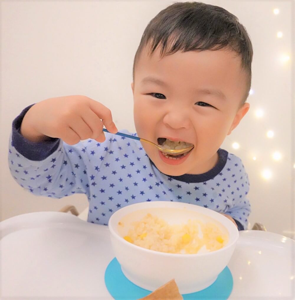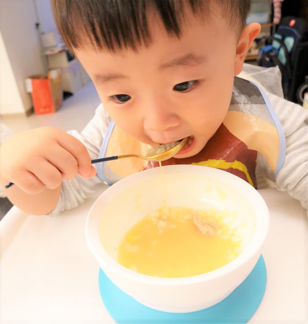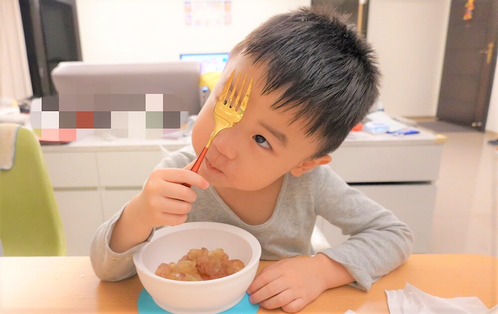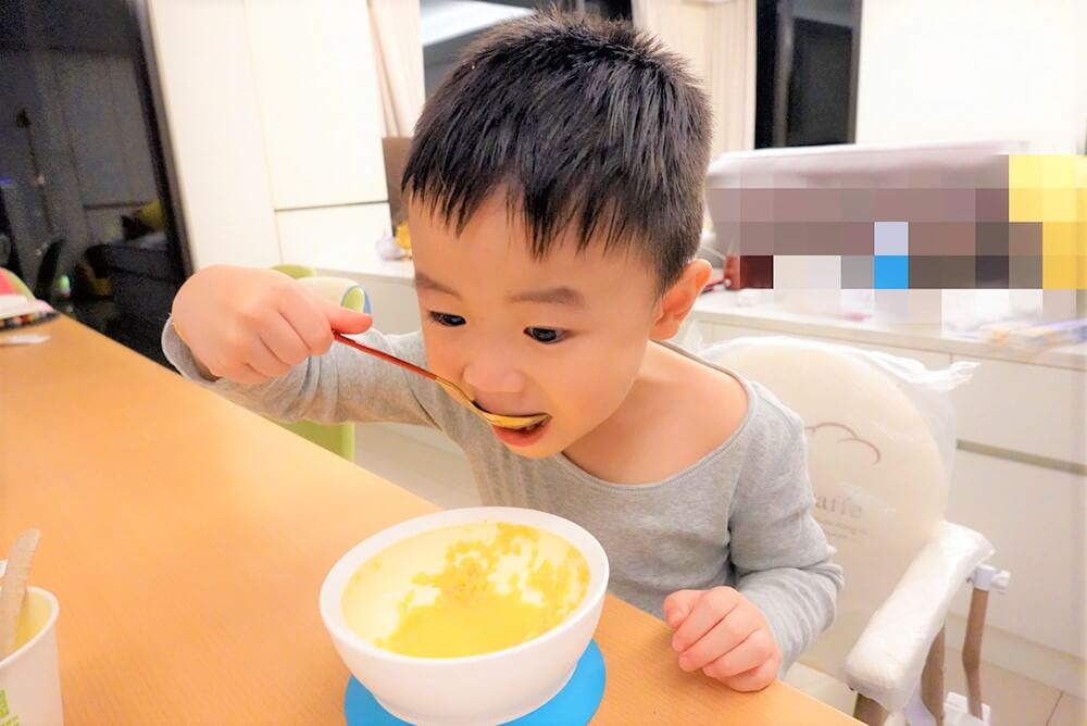 哥哥拿湯匙後,湯喝喝得很好~ 一溜煙就把飯吃光光了!