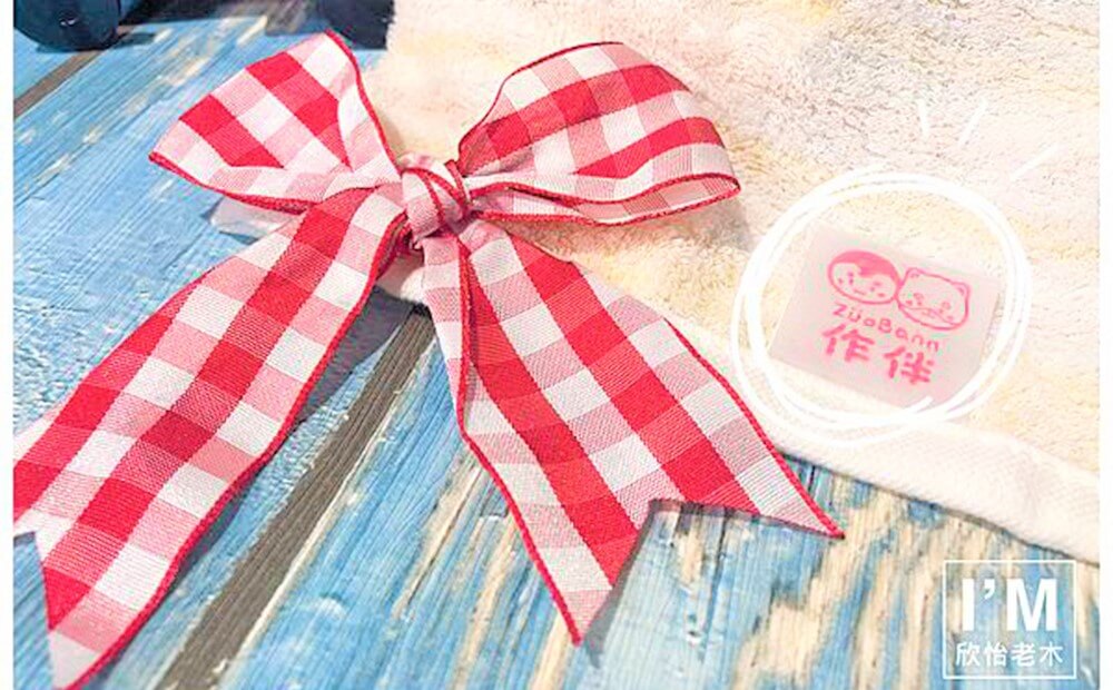 作伴手帕巾的洗標,洗標後面清楚標示了產品相關資訊及注意事項。