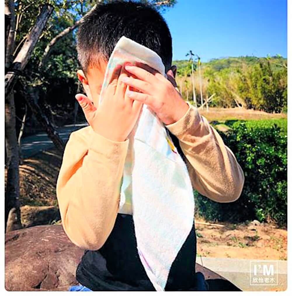 跟著媽媽去員工旅遊,玩到滿頭大汗,這時手帕巾就派上用場了。
