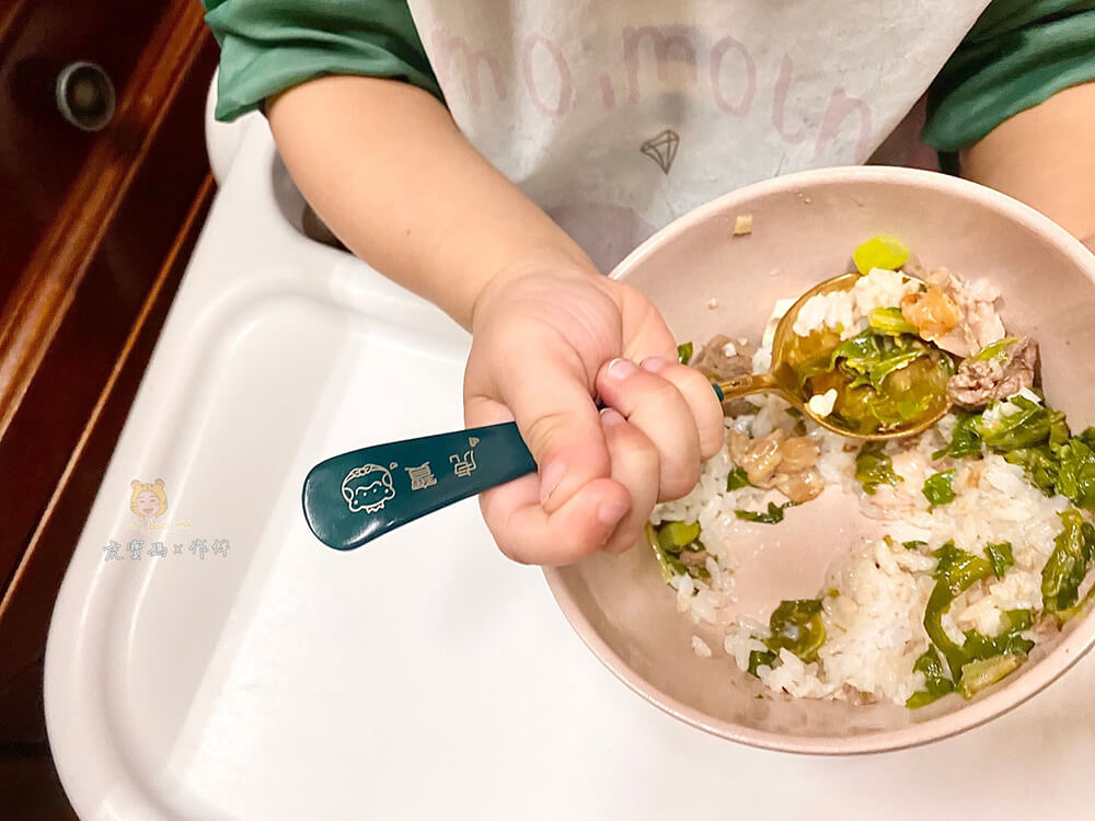 而且虎寶最近在練習反手拿湯匙,