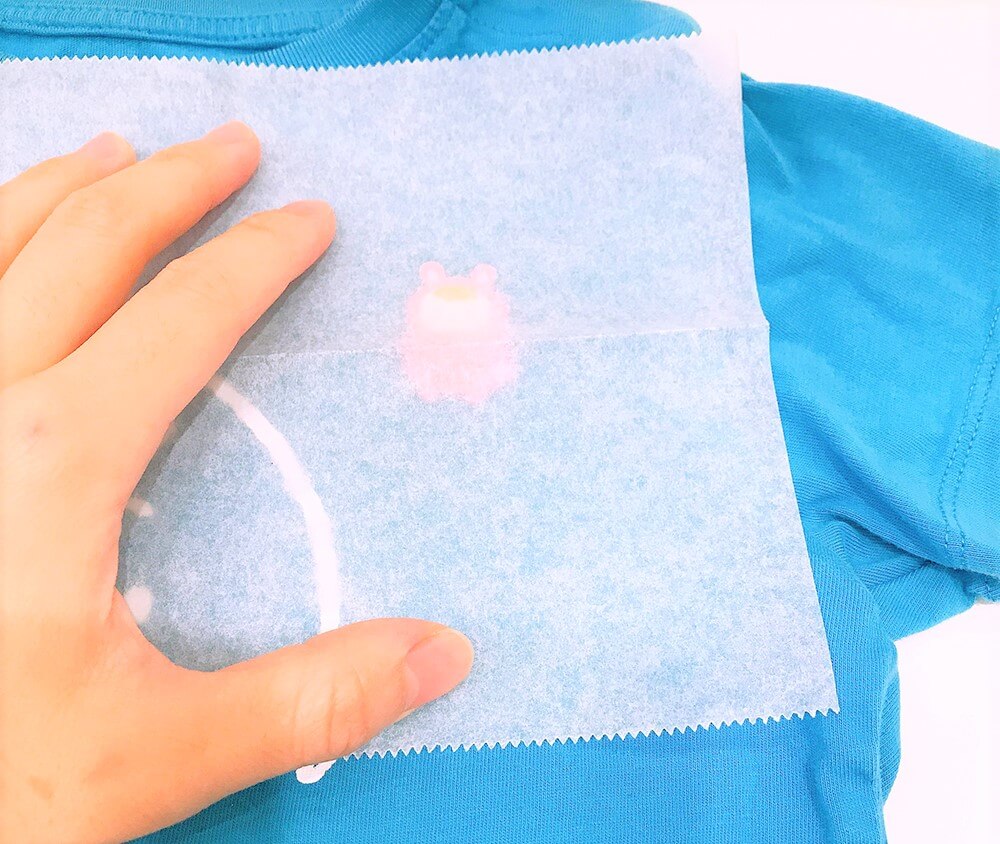 2.燙印貼上面放上烘焙紙,以熨斗來回熨燙。