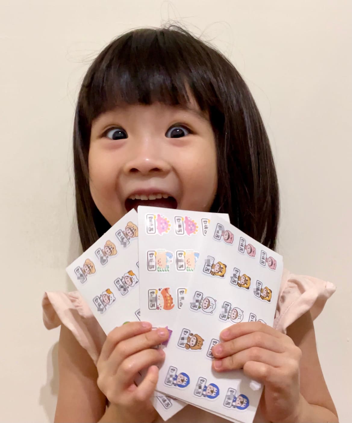 她每次都會指著貼紙說: