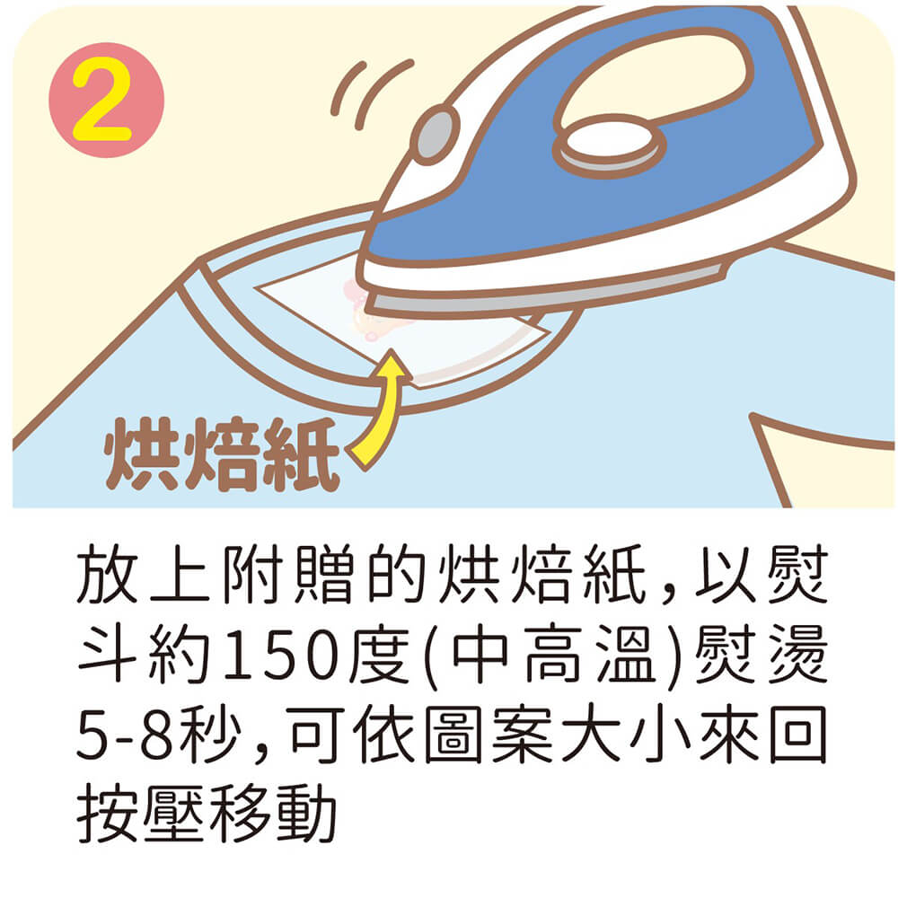 2.上頭放一張烘培紙,用熨斗約150度熨燙5-8秒,依照圖案大小來回按壓移動。