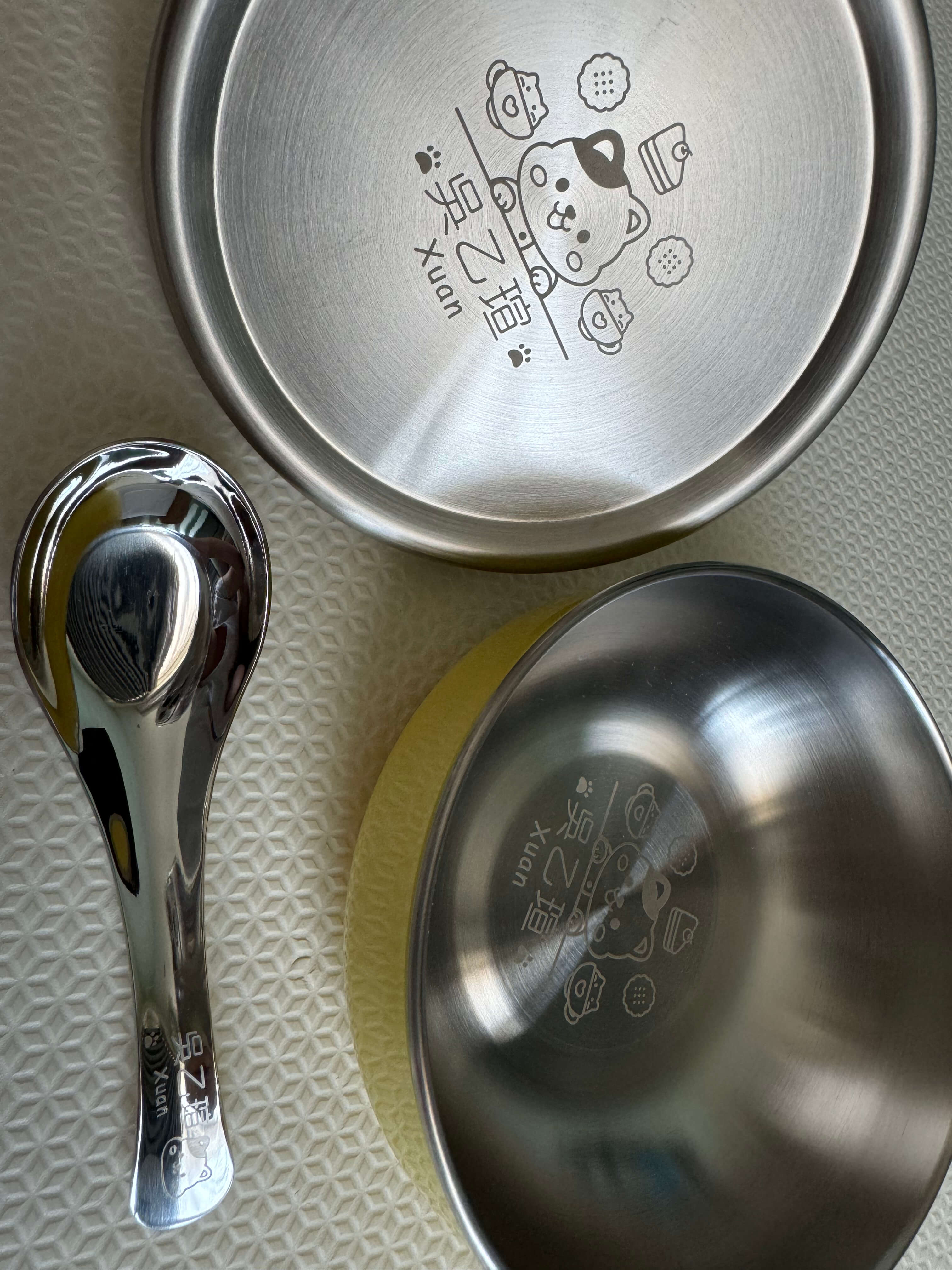 碗蓋、碗內、湯匙上都有精美雕刻的圖案及名字,比起坊間賣的三色碗更加有辨識度又吸引寶寶目光,