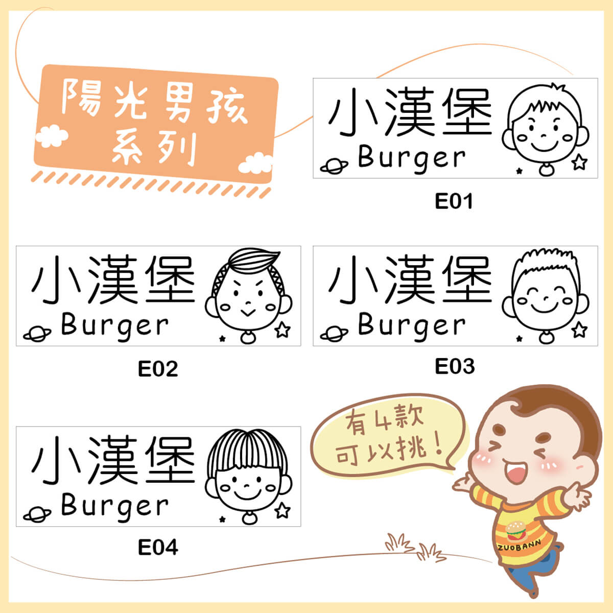 上圖為【陽光男孩】款,四種可愛男孩圖案,選擇多變!