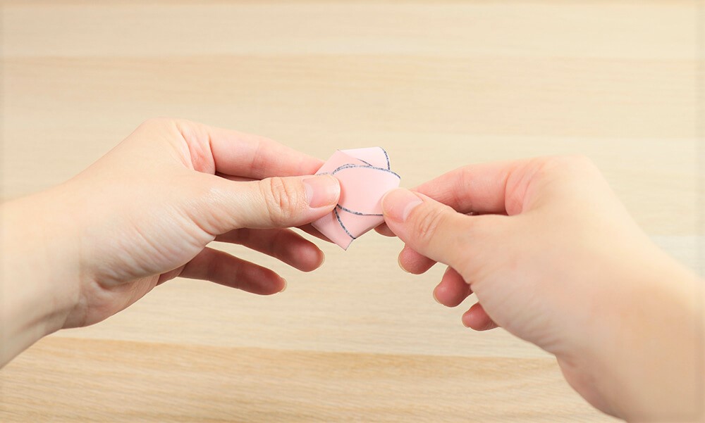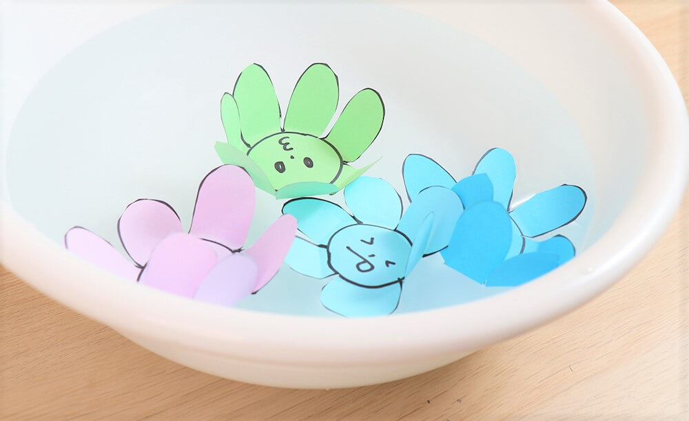 當紙花放在水面中,水進入紙張纖維裡,改變它的張力和形狀,紙花就會展開。