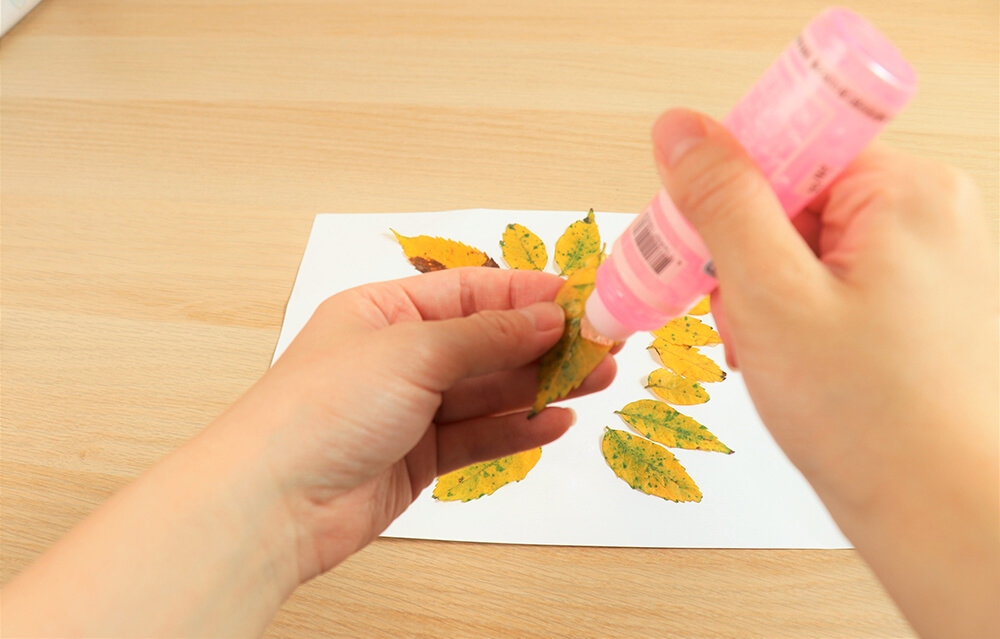 在落葉背面塗上膠水,有些落葉比較脆,記得溫柔貼上唷。