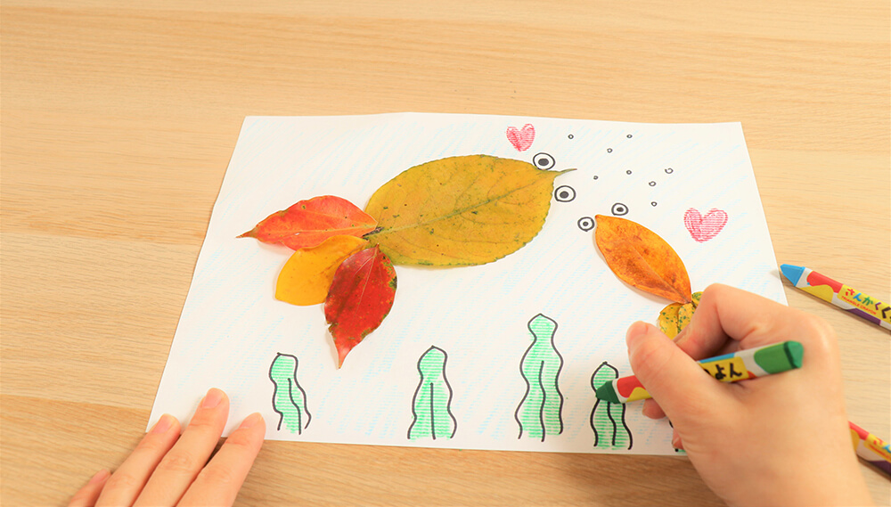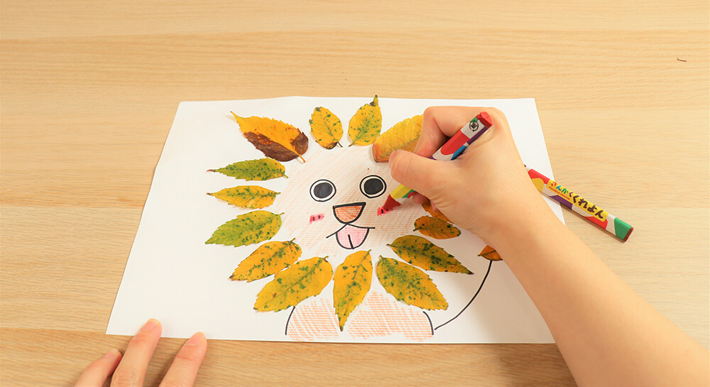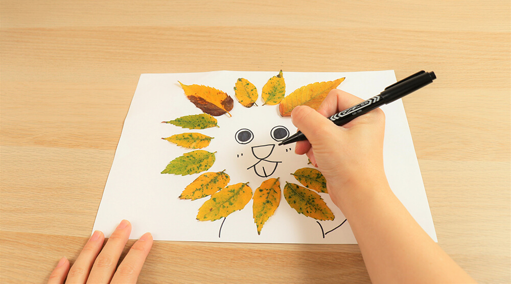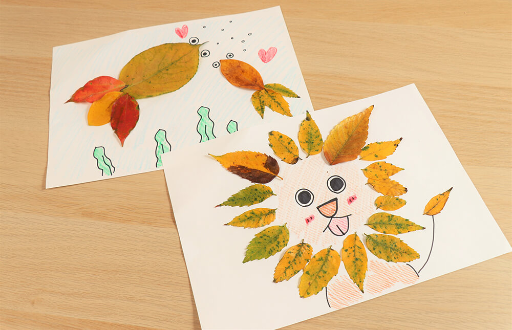 把蒐集的落葉拼貼成小動物,可依照需求做裁剪。
