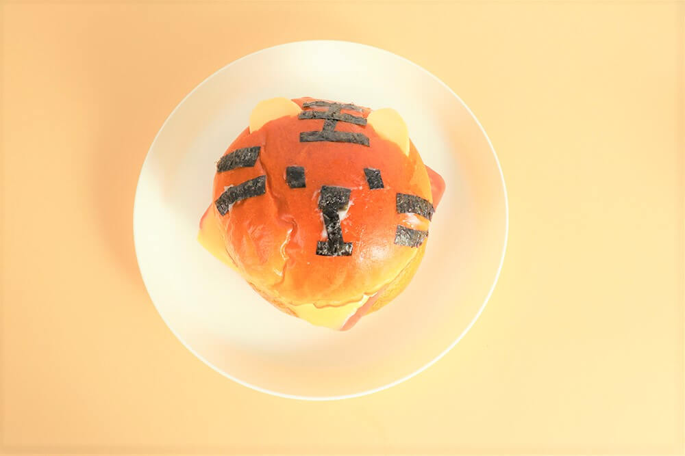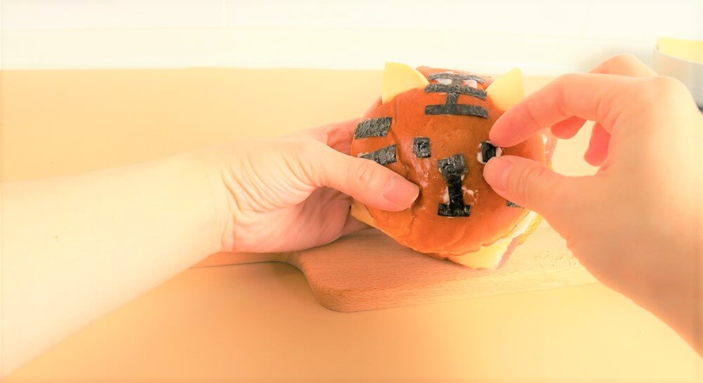 把海苔黏在漢堡蓋子上,拼出老虎的樣子。