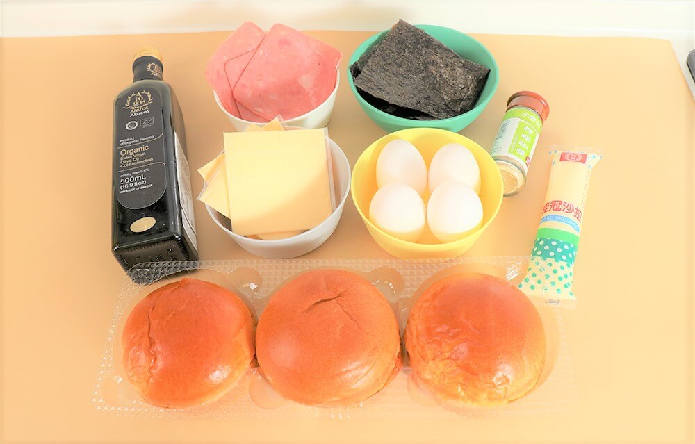 材料:油、雞蛋、起司、火腿、海苔、美乃滋、胡椒粉、漢堡麵包。