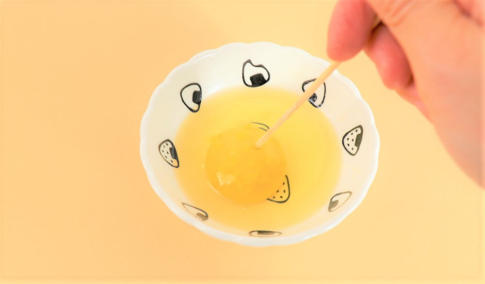 1. 碗內塗上油,打上雞蛋,用竹籤在蛋黃上戳洞。