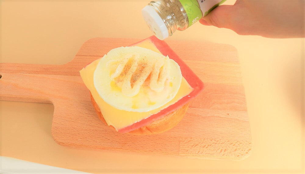 3.依序將材料疊上麵包,在上方擠美乃滋並灑胡椒。