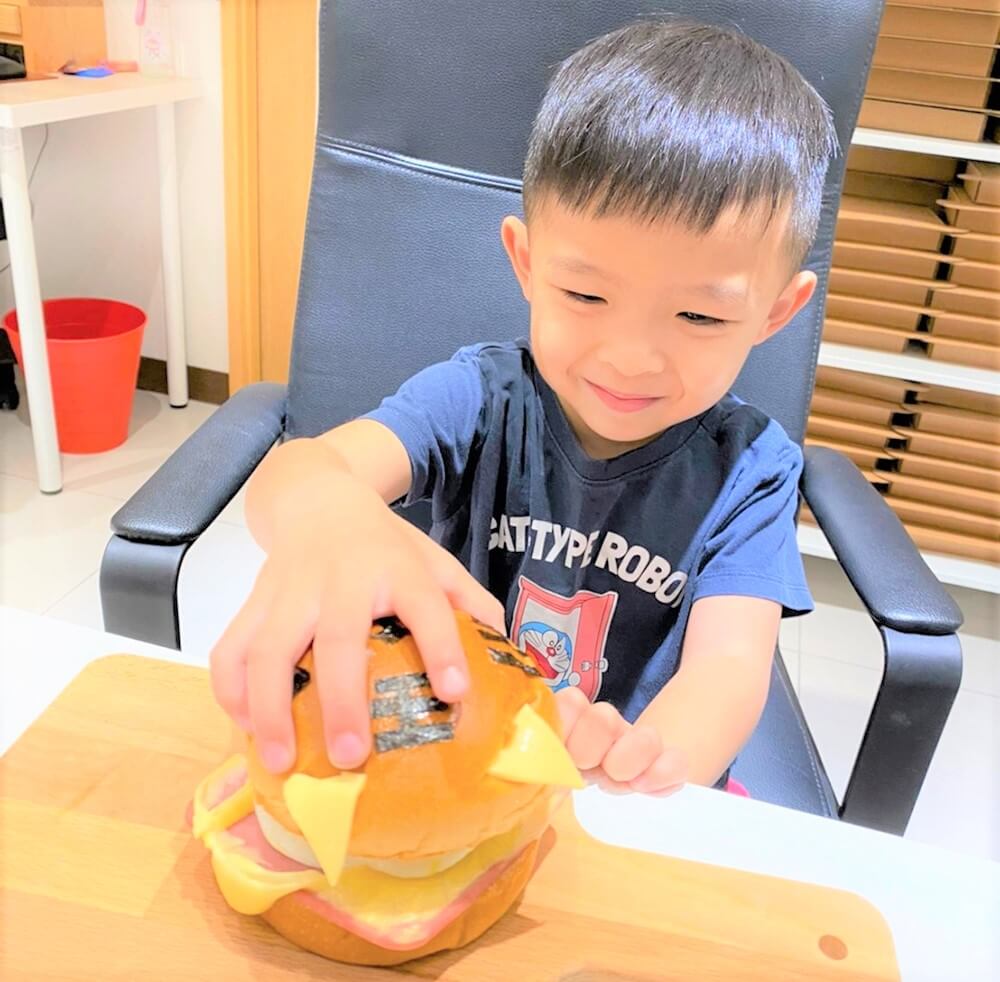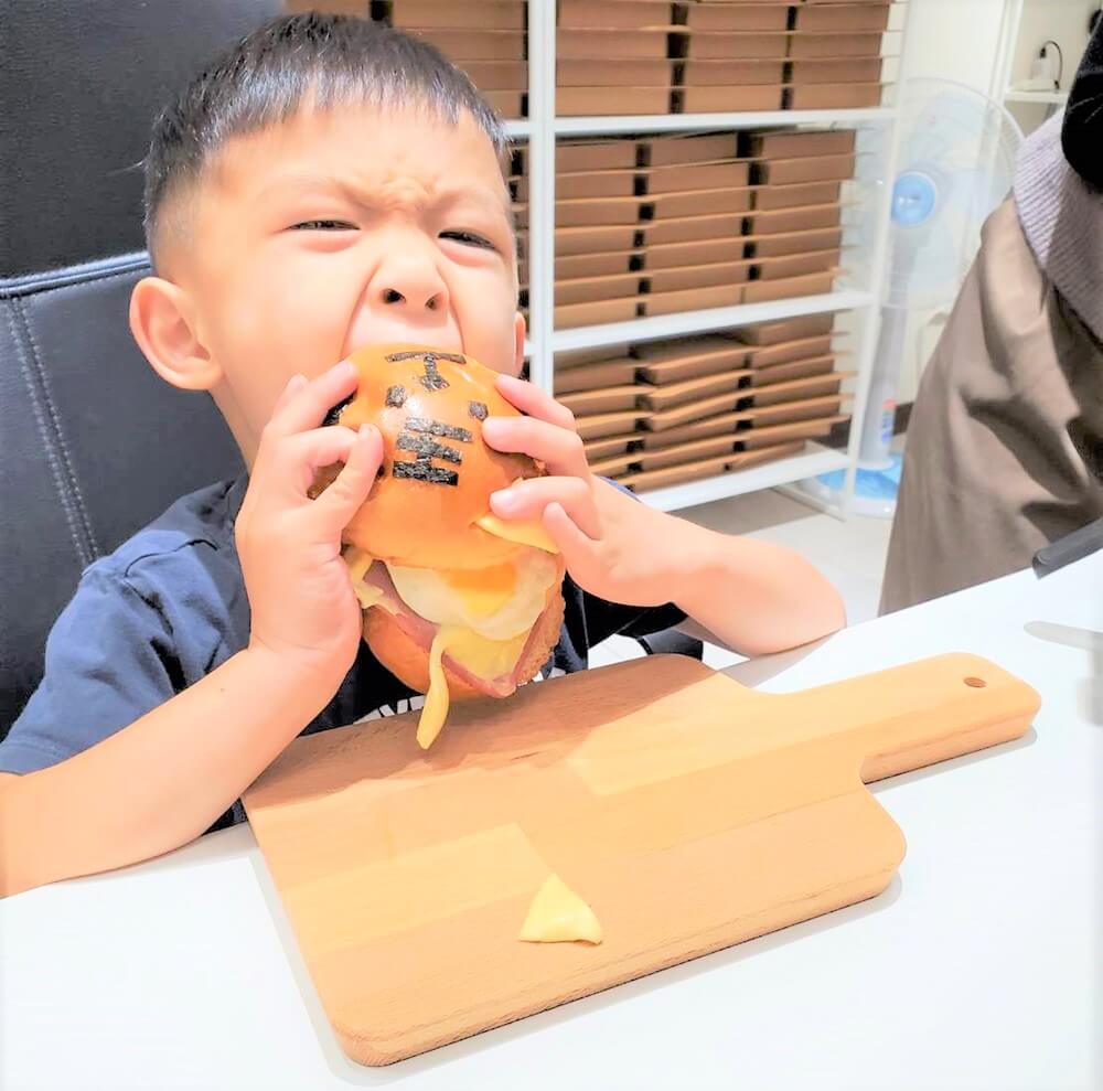 很認真在挖取老虎烘蛋的小漢堡