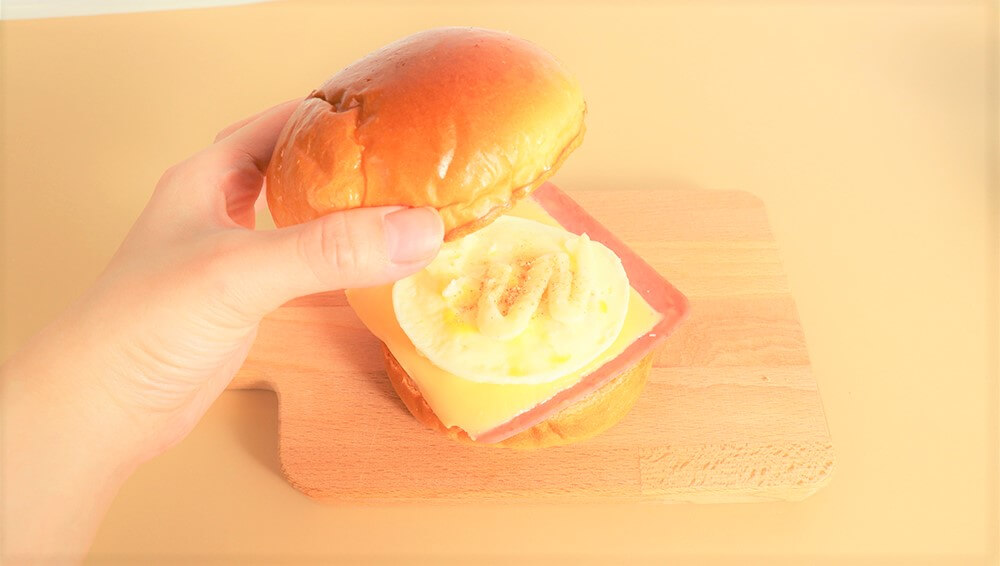 將蛋、火腿起司疊在漢堡麵包上。