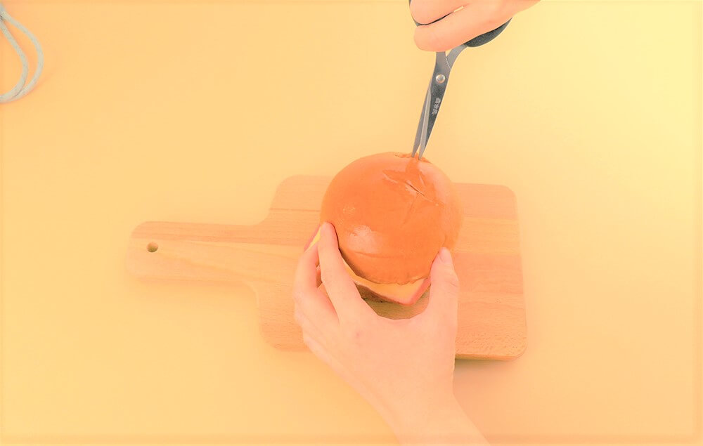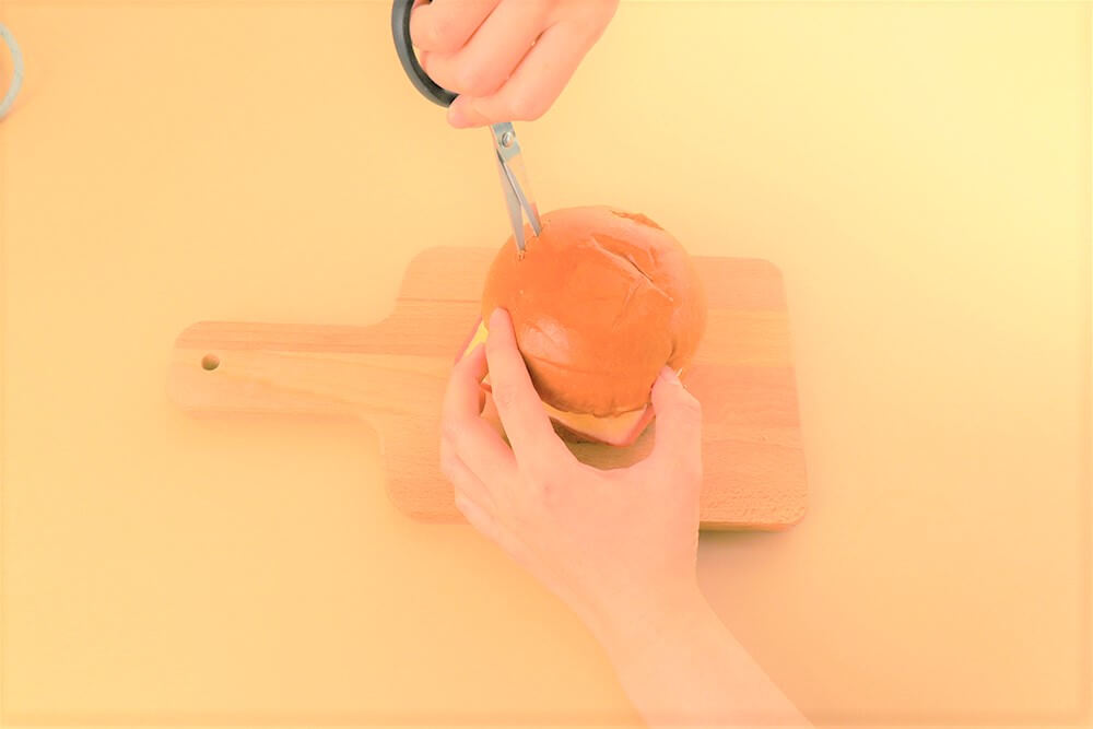 用剪刀在漢堡蓋上剪出小開口。