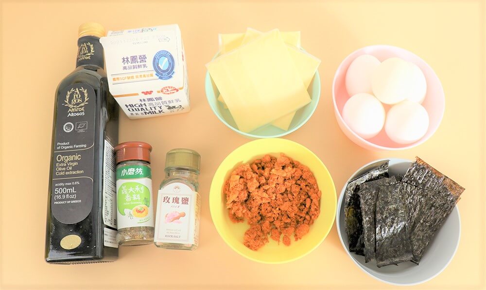 材料:油、雞蛋、牛奶、起司、海苔、肉鬆、調味粉。