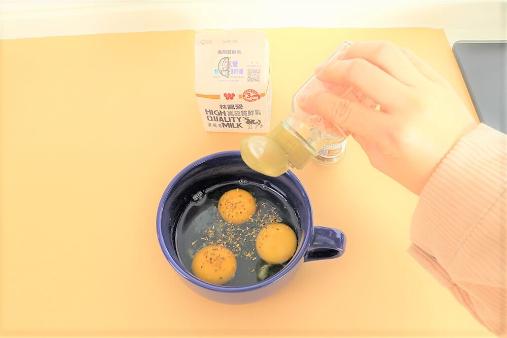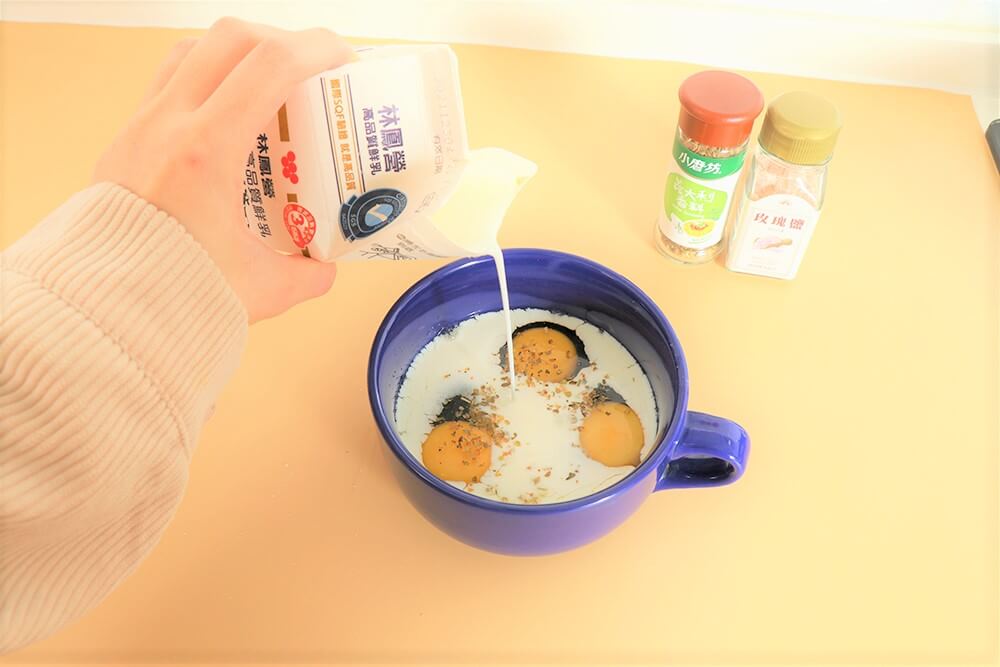 1.打入雞蛋,加調味料、少許牛奶,攪拌均勻。