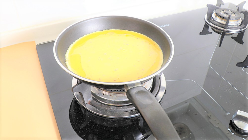 倒入混和蛋液,並左右搖晃使均勻受熱。