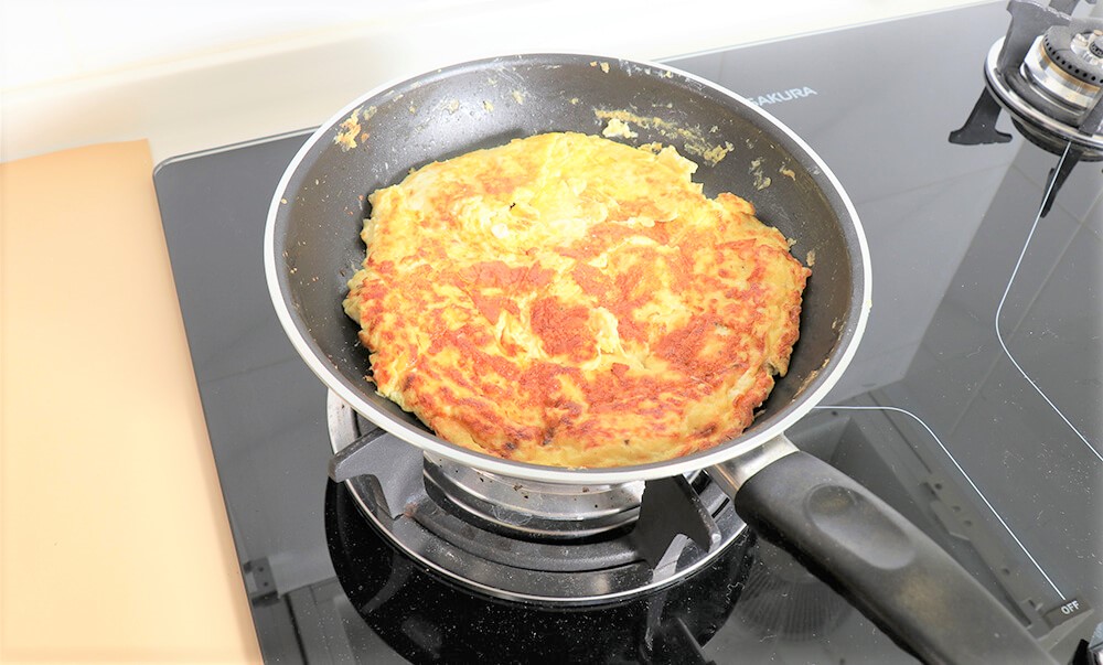 4.確認凝固後,拿盤子蓋住平底鍋,倒扣讓烘蛋翻面