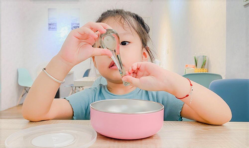 每個碗都附上一支湯匙,顏色也能自己搭配,湯匙大小幼兒拿剛剛好