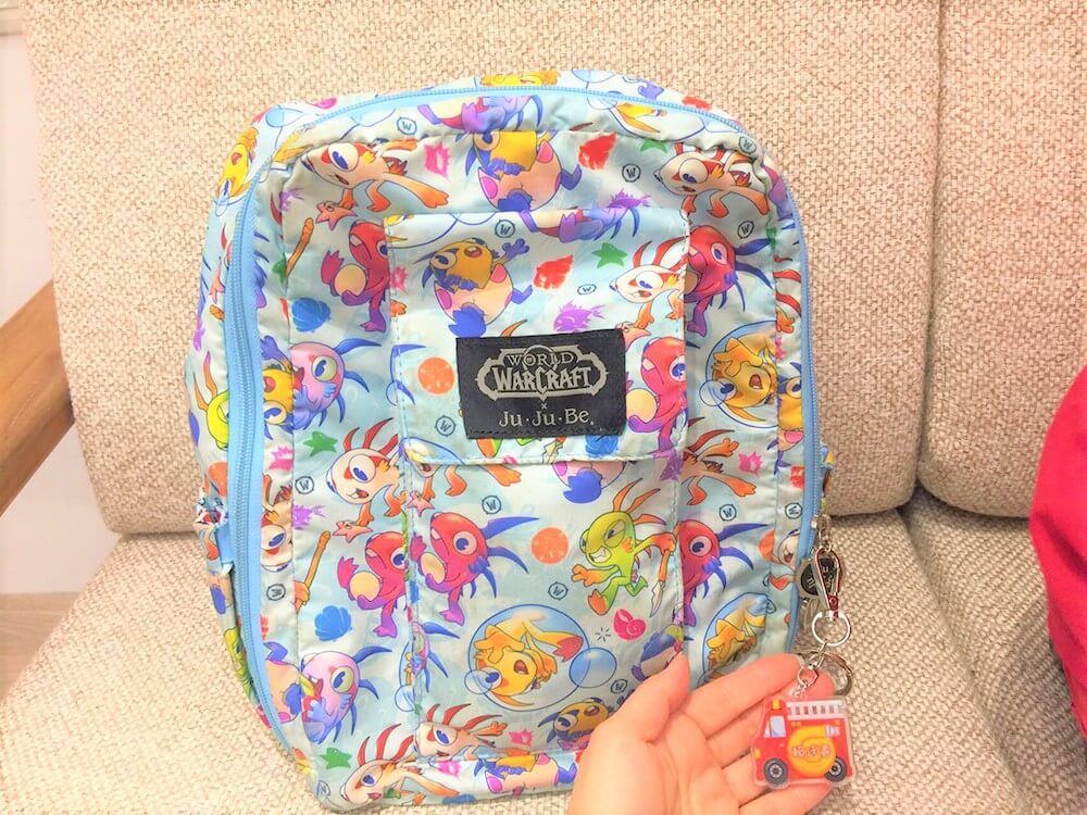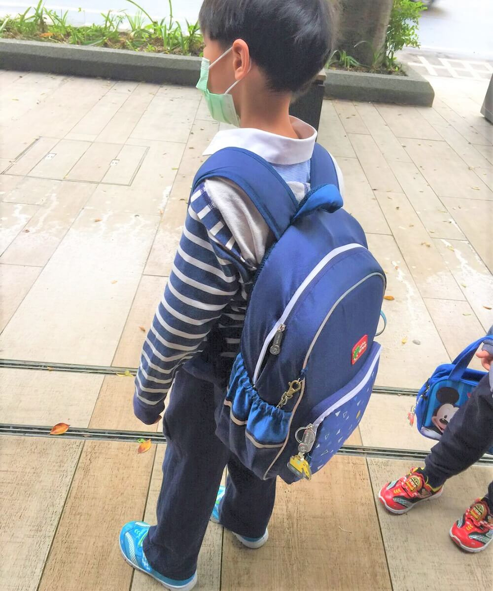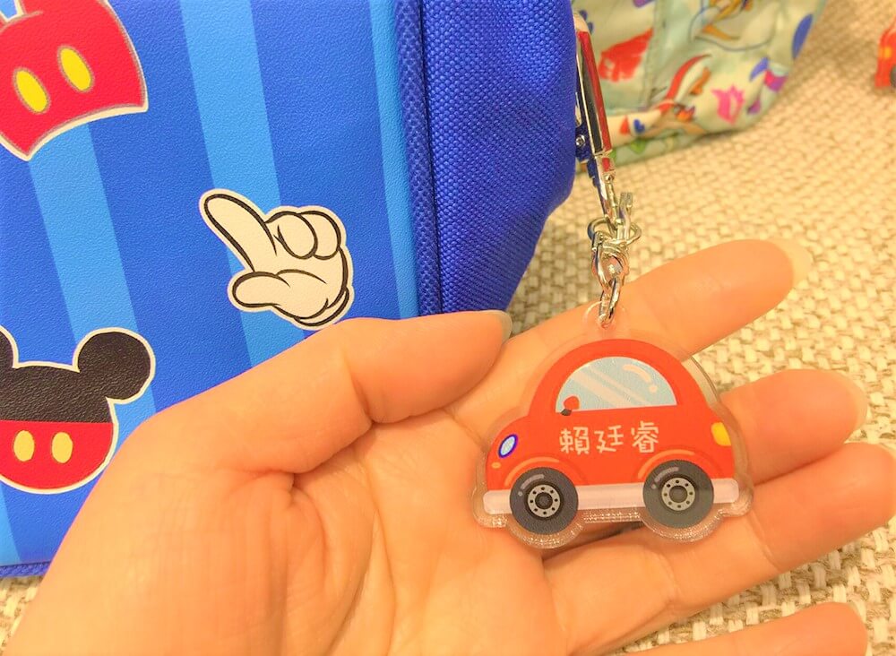 哥哥讀國小,所以他書包很大,挖土機鑰匙圈就掛在外側,一目了然啦!