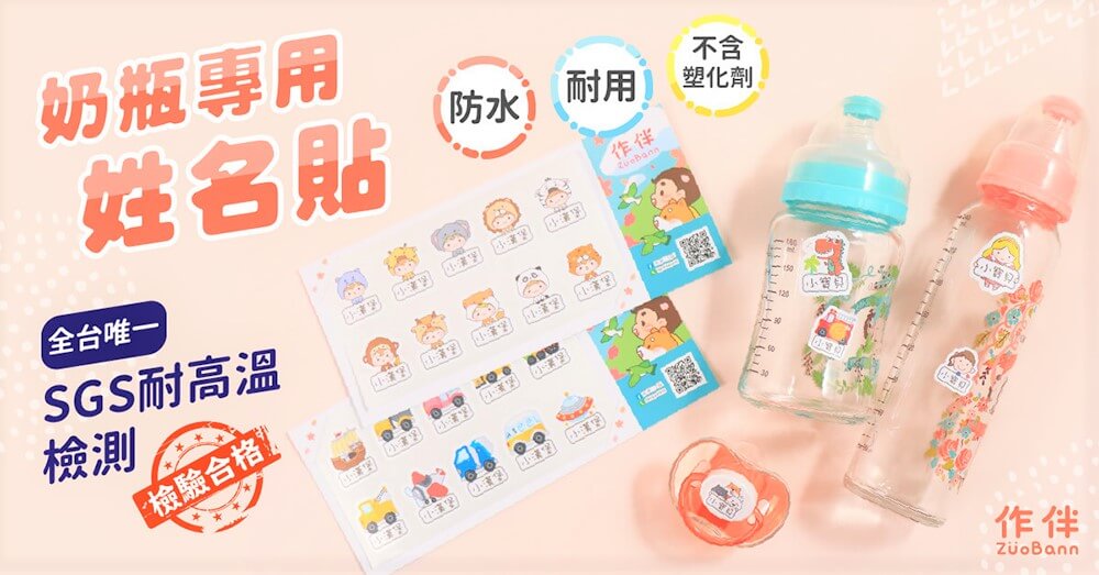 ▲作伴奶瓶姓名貼是全台唯一通過SGS耐高溫檢測且不含塑化劑的貼紙唷~