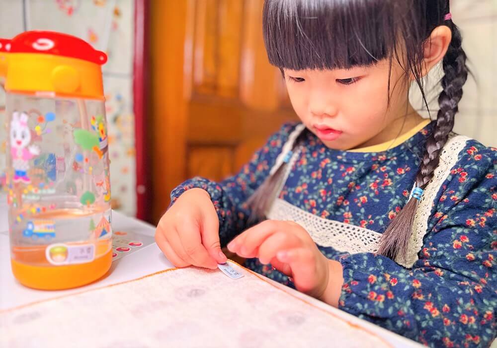 霓霓拿到後立刻把水壺和書本都貼上名字,