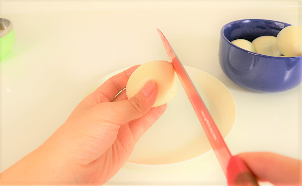 將雞蛋底部切平。
